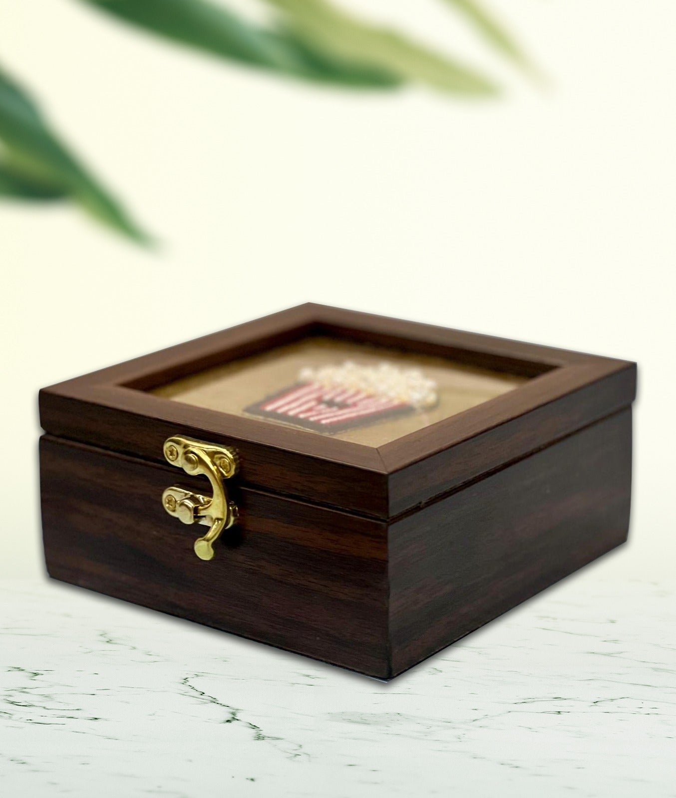 Add a dash of whimsy and charm to your décor with our Popcorn Patchwork Embroidery Box. Featuring intricate hand-embroidered motifs preserved under a smooth glass top, this piece blends playful design with artisanal craftsmanship.